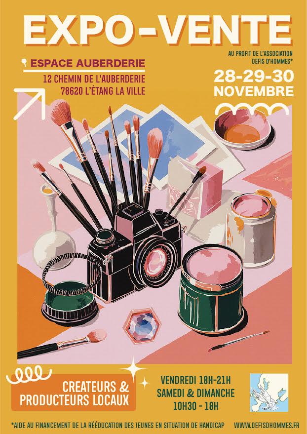 ∞ Du 28 au 30 novembre à l’Espace Auberderie de l’Etang la Ville, se tiendra une expo vente au profit de l’Association Défis d’hommes qui aide au financement de la rééducation de jeunes en situation de handicap. Nous relayons cette information car trois de nos adhérents, artistes, Catherine P, Catherine M et Pascal, font partie des exposants. N’hésitez pas à leur rendre visite pour les soutenir. Plus d’information ICI