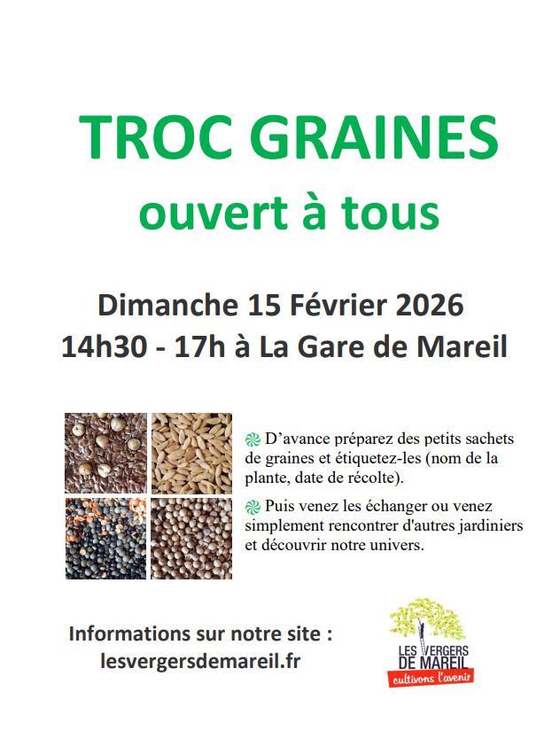 - Les Vergers de Mareil apparaissent dans quatre articles du magazine Mareil Côté Village n°33 paru en janvier : page 6 : » Vendanges de la Vigne de Clochemerle « , page 7 » Sensibilisation des enfants au jardinage » et » Bosquet urbain : plantation de dix arbres offerts par les Vergers de Mareil « , page 28 » Balisage des sentes de Mareil-Marly «